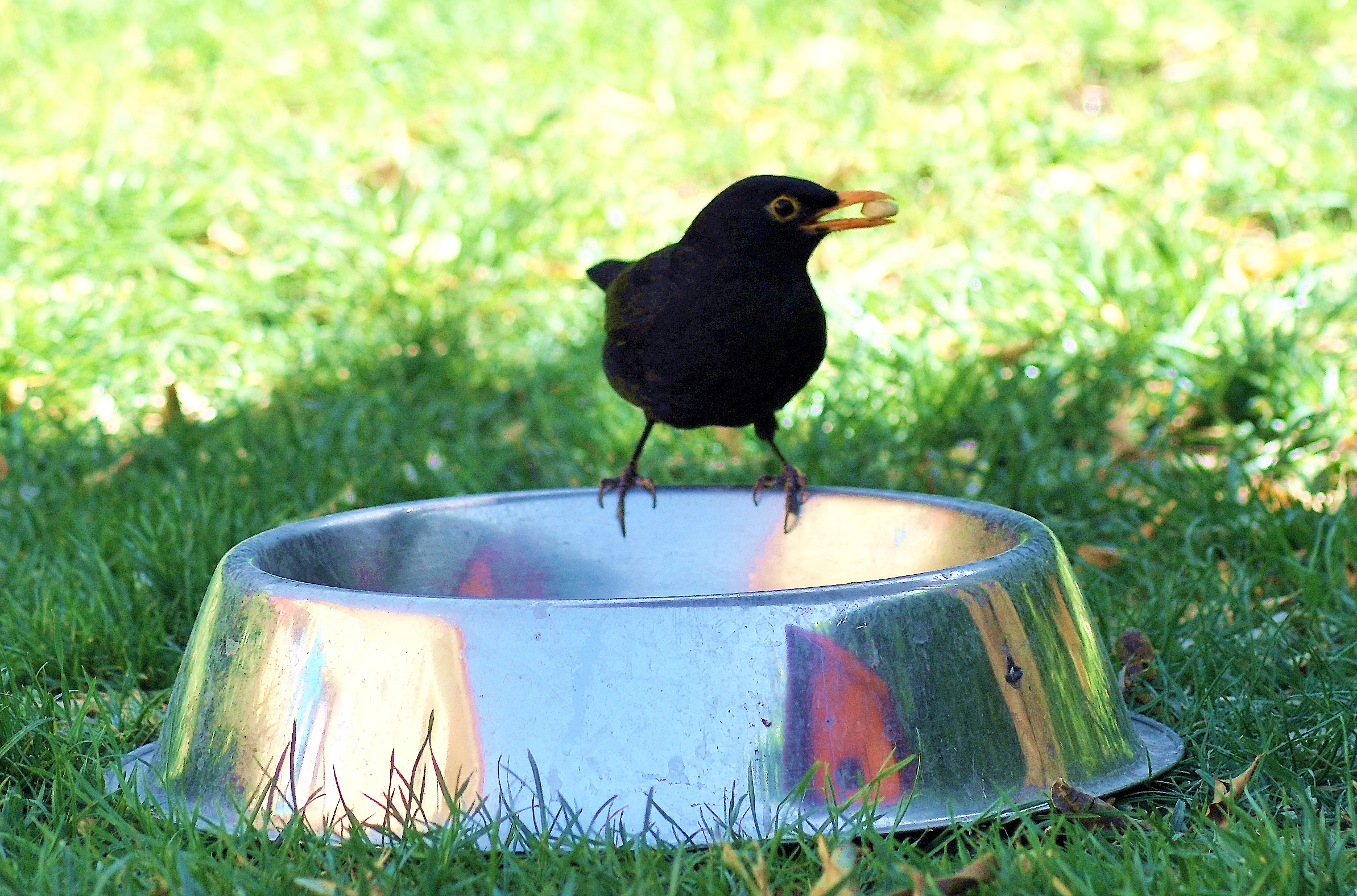 Mirlo(turdus merula)macho, pillado justo cuando se comía el pienso del perro.