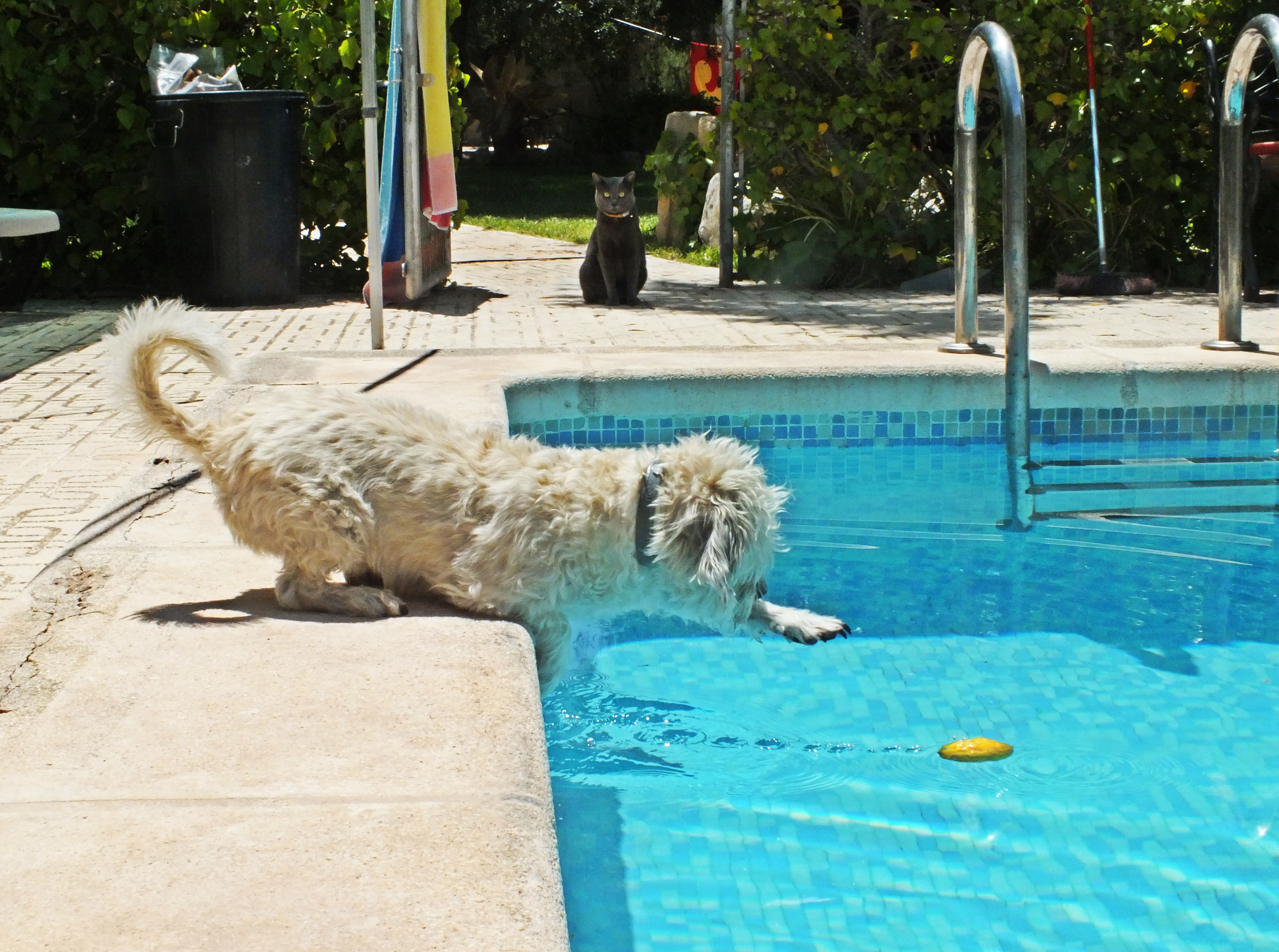 Todos los días, la perra tira un limón a la piscina e intenta recuperarlo bajo la atenta mirada del gato, que sabe como va a terminar la cosa: con la perra en el agua.