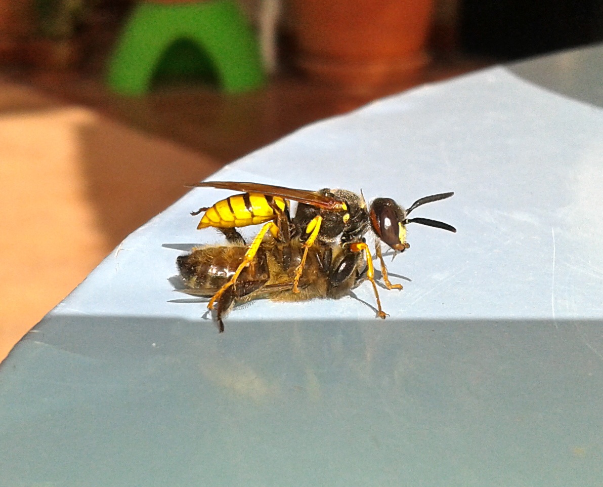 El ataque de una avispa a una abeja tuvo como resultado unos angustiosos minutos de la primera arrastrando el cadáver de su oponente sin poder liberarse de su abrazo.