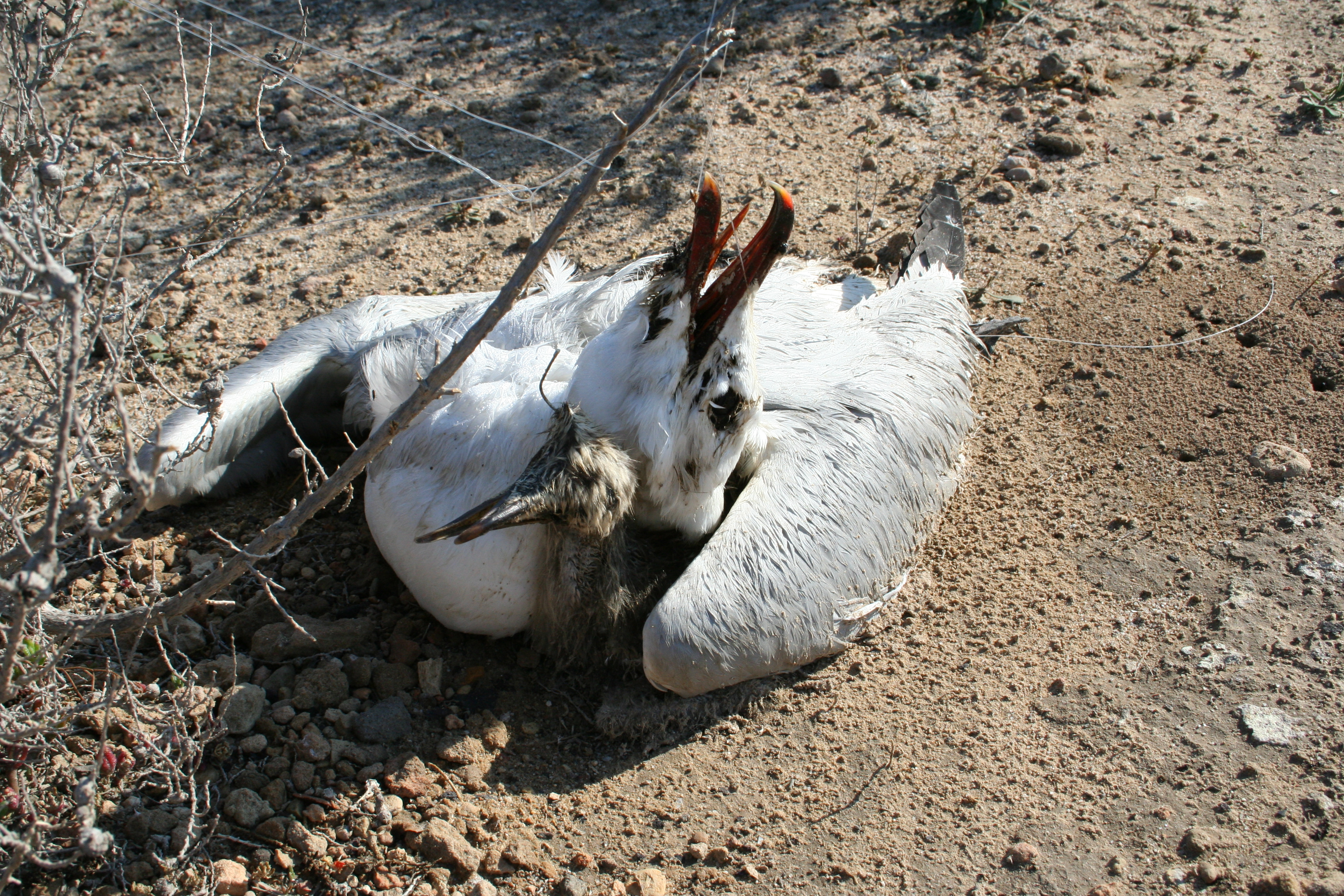 Gaviota de Audouin y su pollo muertos por anzuelos e hilo de pescar cuando lo iba a cebar.