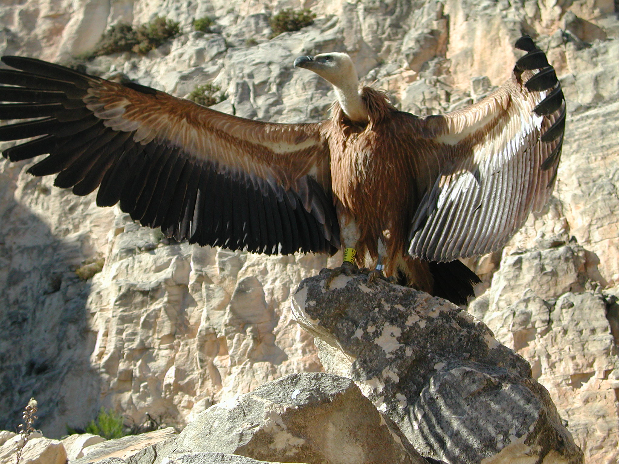 Postura de un buitre leonado después de su transporte a la buitrera de Alcoy del Proyecto Canyet
