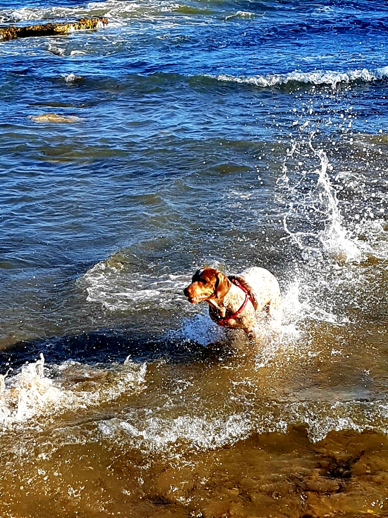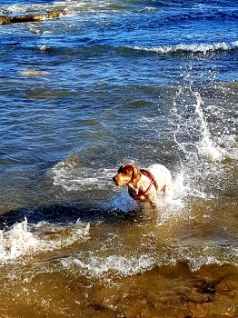 Las gotas de agua que penden a su alrededor, la espuma levantada acentúa la velocidad que le imprime el animal a su carrera. La luminosidad, las olas rompiendo en segundo plano, los leves reflejos del perro sobre el agua, la transparencia del suelo, que se aprecia ya marrón en el primer plano… recuerdan en cierto sentido a algunas de las escenas playeras de Joaquín Sorolla.