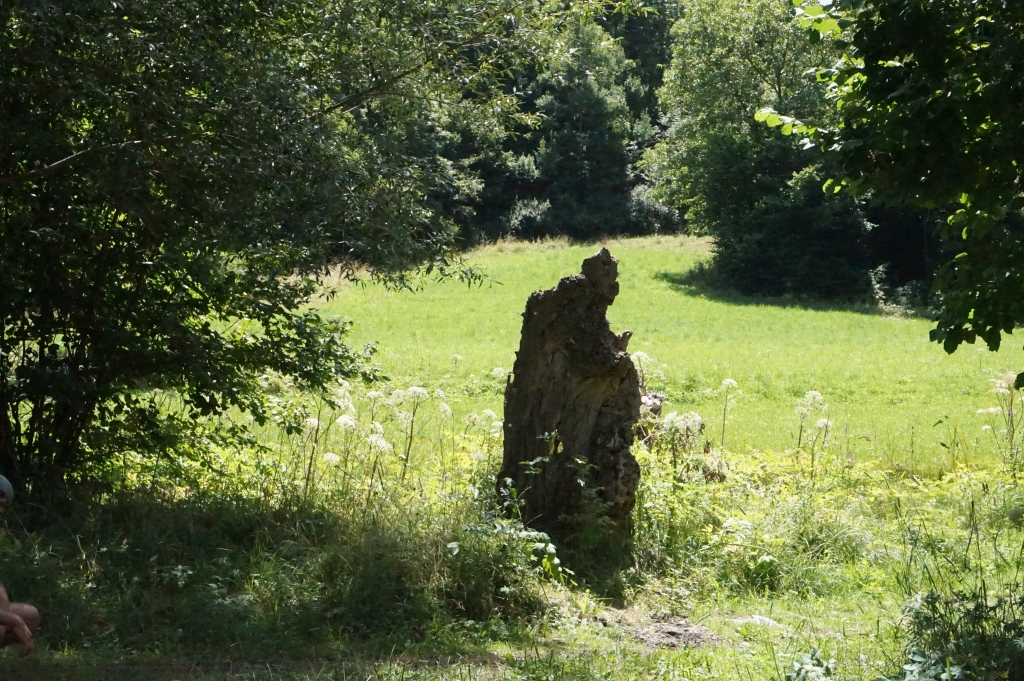 Un tronco de árbol seco, violentamente arrancado, que emerge en un paraje natural ciertamente bucólico, que incita a la relajación, a la meditación tranquila. El protagonista de la escena no tiene que reivindicarse con colores llamativos, con una forma complicada. No. Su imagen no transmite dinamismo sino todo lo contrario, llama la atención por su quietud serena, por el juego de sombras y formas que, moldeadas de forma tan caprichosa, despiertan súbitamente la imaginación del espectador. Sí, la foto así encuadrada, con tal enfoque, desde esa distancia, con esa luminosidad, esas sombras y ese entorno proyecta lo que el autor apreció en un primer momento desde el objetivo de su cámara. Lo que él vió y supo transmitir: uno intuye la sotana, la túnica y el manto, incluso el solideo acabado en fina punta se aprecia sobre la cabeza del eclesiástico.