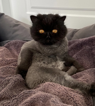 La antinatural pose de su cuerpo –tan retorcido con respecto a su cabeza, los ojos con las pupilas tan contraídas, reducidas a su mínima expresión, impactan tanto como el contraste cromático. Ojos anaranjados en una cabeza bien negra y un cuerpo de tonalidad más clara, parda. Resulta complicado deslindar entre la manta que lo rodea y sobre la que se posa y el contorno del propio felino. A simple vista, la cabeza parece sostenerse en el vacío y en ella los protagonistas vuelven a ser esos ojos, sin una boca abierta que distraiga. Sólo ojos. Sí, la foto definitivamente deja al espectador tan ‘pillado’ como al propio gato su amo.