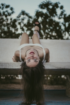 Las fotos transmiten bien un mensaje, bien sensaciones,bien un poco de ambas cosas. En este caso la reacción del espectador es lo que prima: la imagen provoca una inevitable sensación de mareo. Uno debe de indagar en el entorno de la protagonista para conocer más sobre una perspectiva forzadamente impropia, no natural. La posición del fotógrafo y de la fotografiada no quedan claras. La gravedad hace colgar la melena de la chica, extendiéndose hasta rozar el suelo, ésa es la pista delatadora de la ubicación de cada cual pero, aun así, los sentidos engañan a la razón. El cuerpo de la joven parece suspendido, o se aprecia si está sentada o quizá boca abajo. Su pierna derecha, la única en la que se aprecia el pie parece dejarse llevar. ¿El fotógrafo está en una altura superior y sigue la vertical o se sitúa a la altura de su cara, a su mismo nivel?. El pelo, caído, indica lo segundo, pero uno debe fijarse y deducir para reubicar la imagen y comprobar la perspectiva. Genera dudas. La expresión de la joven, las cejas arqueadas, la mirada fija en el fotógrafo, en el espectador, parecen transmitir ese mensaje de lo inverosímil, de lo alternativo, de lo poco convencional y desinhibido. Los labios pintados de rojo carmín contrastan con el blanco de los dientes en una boca entreabierta y remarcan, sibilinos, su mentón triangular. Ella es atractiva pero no destaca por eso. Lo hace porque se muestra diferente, con el desparpajo característico de la juventud, de las ganas de vivir y experimentar.
