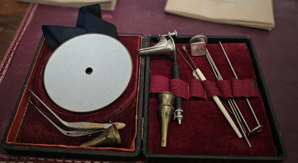 La imagen muestra un maletín con instrumental de principios del siglo XX cuidadosamente dispuesto sobre un fondo de terciopelo rojo. En él se reconocen piezas de exploración y tratamiento, reflejo de una época en la que la profesión veterinaria se consolidaba y modernizaba, dando pasos firmes hacia una medicina más técnica y científica.