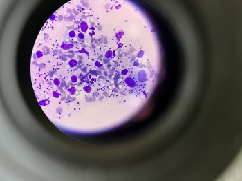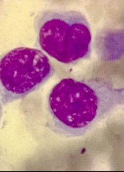 La obra muestra una citología de un nódulo cutáneo, en la que la tinción revela con gran nitidez los núcleos celulares. El autor, con mirada creativa, ha sabido captar y resaltar un detalle singular: dos núcleos adosados que evocan la silueta de un corazón. De este modo, una muestra clínica, rutinaria en la práctica veterinaria, se convierte en un símbolo visual cargado de sensibilidad.