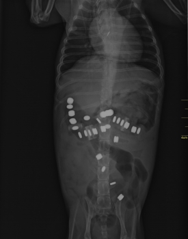 La radiografía muestra el abdomen de una perrita yorkshire terrier de 14 años, donde se aprecian con claridad varias piezas ingeridas que, a ojos del espectador, evocan inmediatamente las fichas de un tablero de parchís. El autor, con ingenio, acompaña la imagen de un título y una descripción que refuerzan la carga narrativa, logrando que una situación clínica compleja se convierta en un guiño simpático y entrañable.