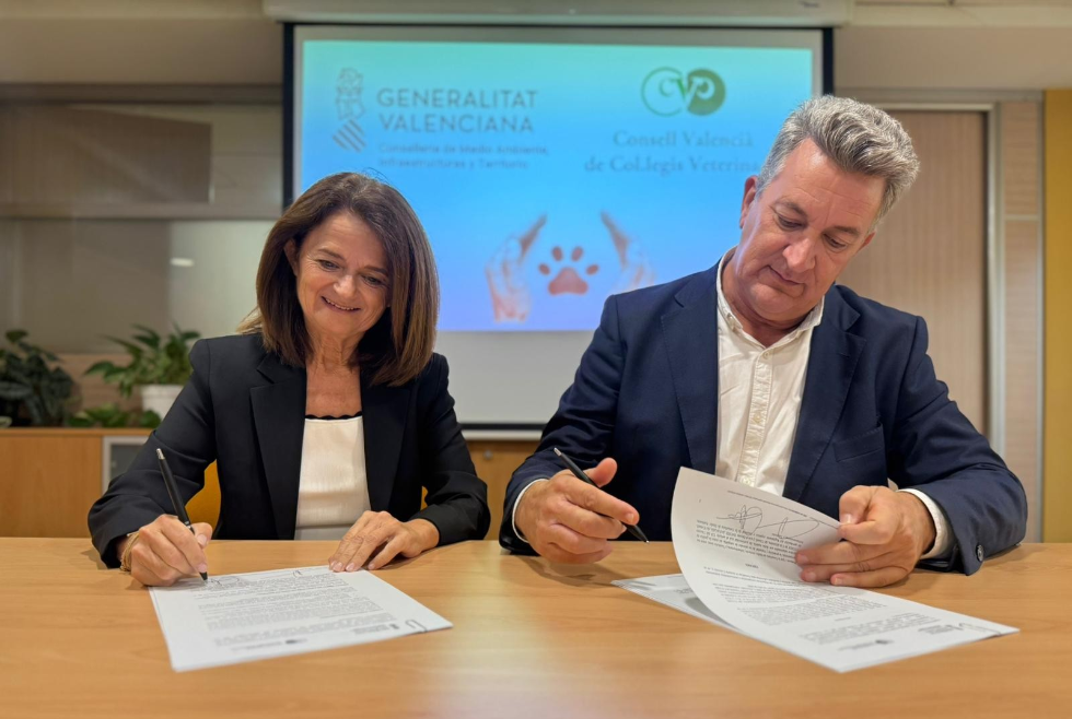 El conseller de Medio Ambiente, Infraestructuras y Territorio, Vicente Martínez Mus, y la presidenta del Consell Valencià de Col·legis Veterinaris (CVCV), Inmaculada Ibor, han suscrito este jueves, 23 de octubre, la actualización del convenio para la gestión del Registro Supramunicipal de Identificación de Animales de Compañía de la Comunitat Valenciana (RIVIA).