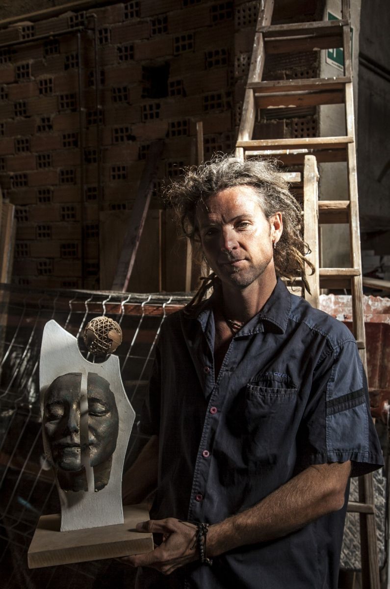 El artista Carlos Lorenzo Hidalgo y la representacion de su escultura "Somos Uno" en miniatura. Fotografía de Información TV