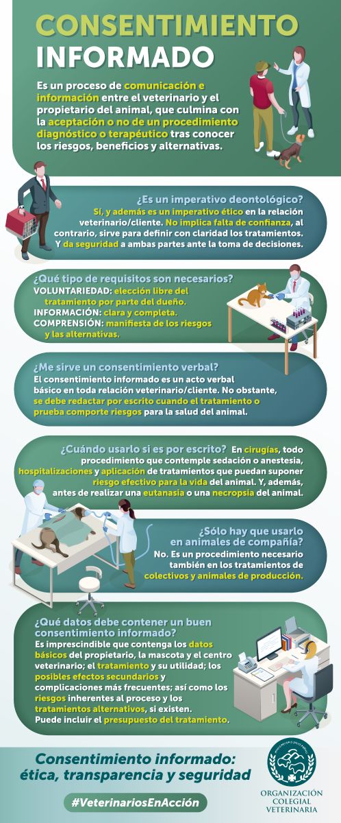El consentimiento informado es un proceso de comunicación entre el veterinario y el propietario del animal mediante el cual se facilita información clara, suficiente y comprensible sobre un procedimiento diagnóstico o terapéutico, permitiendo la aceptación o rechazo del mismo.